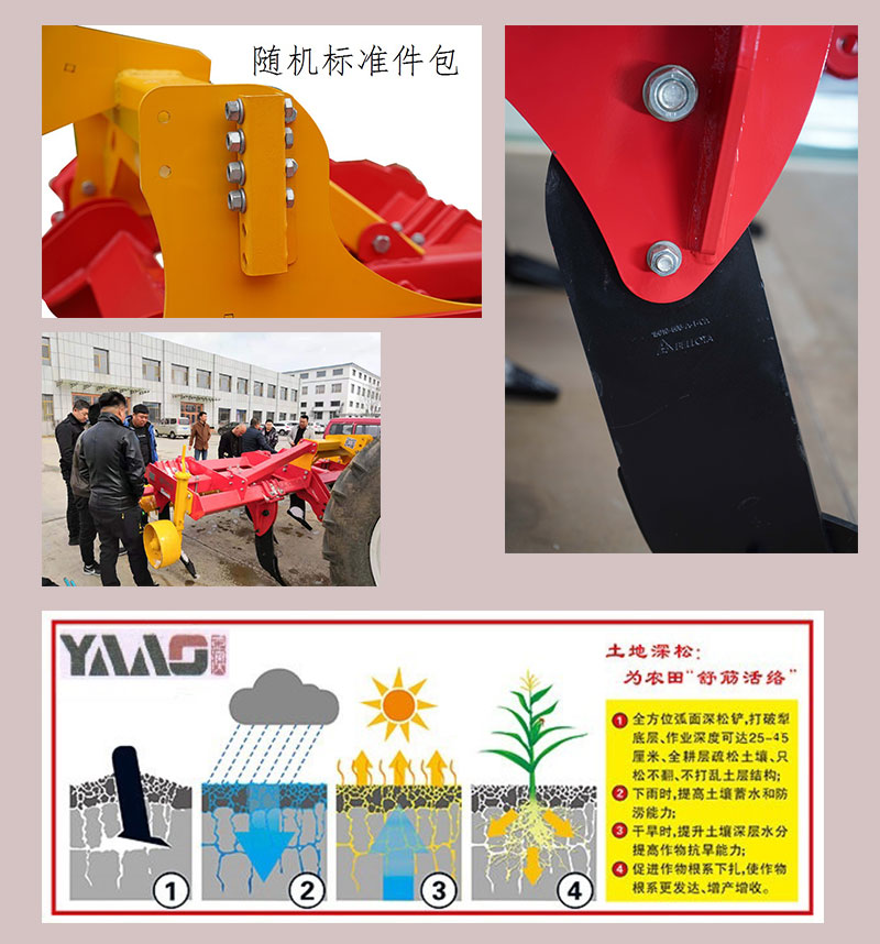 4、使用效益高; 采用原裝進(jìn)口硼鋼深松鏟,具有高強(qiáng)度和超耐磨性,比傳統(tǒng)部件使用壽命提高3-4倍,并利用保險螺栓進(jìn)行過載保護(hù)。使用壽命長