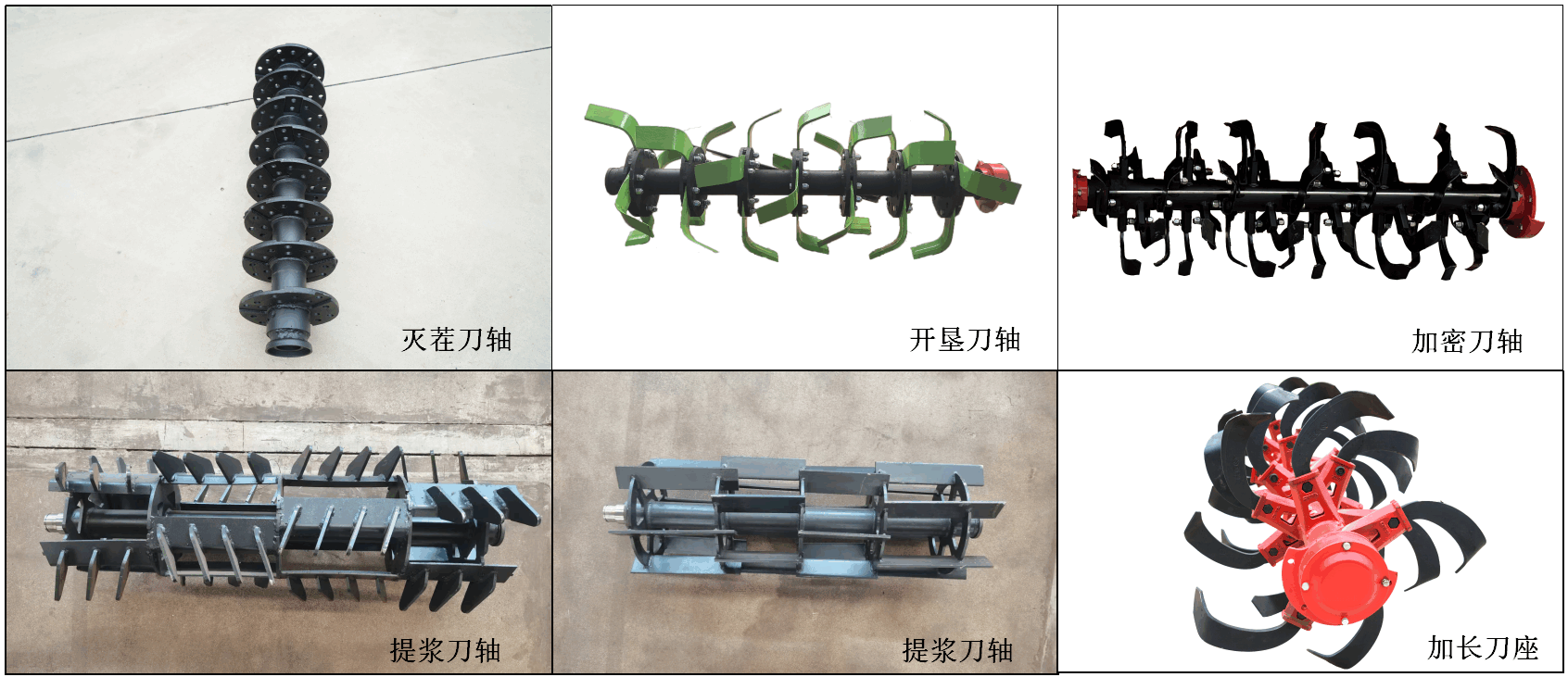 可根據(jù)水旱田及農藝需要配制:滅茬刀軸、開墾刀軸、加密刀軸、提漿刀軸、加長刀座