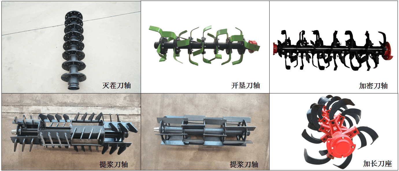 可根據(jù)水旱田及農(nóng)藝需要配制:滅茬刀軸、開墾刀軸、提漿刀軸、加密刀軸、提漿刀軸、加長刀座