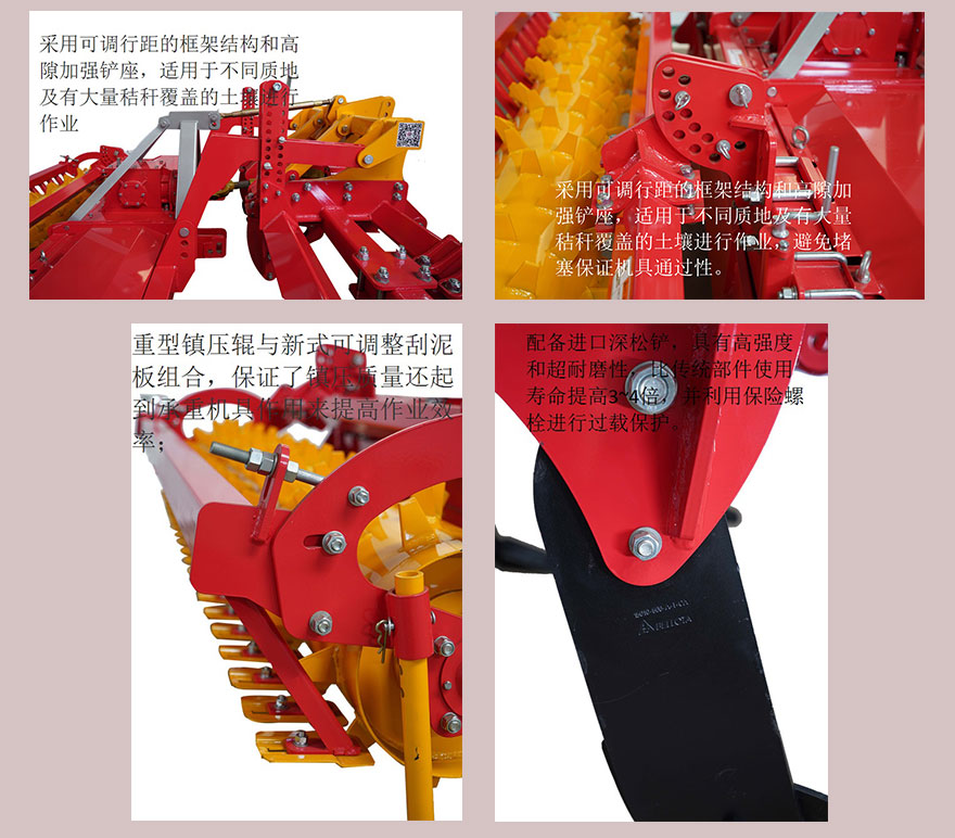 6、深松單元采用鑿型鏟翼式結(jié)構(gòu)組合,單鏟幅寬可達(dá)26厘米,深度可達(dá)33厘米。翼鏟高度可調(diào),可滿足不同耕作需求;