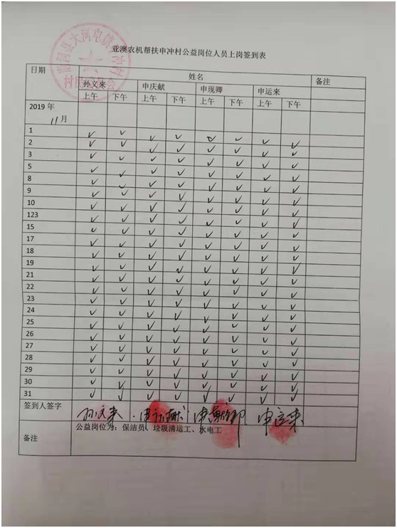 除此之外,我公司聯(lián)合村委會照顧一些特別貧困但有行動(dòng)能力的老人為村部垃圾清運(yùn)、水電維修、村落清潔等,并為此購買公益崗位,每月定期給這些公益崗位發(fā)放工資500元/個(gè)月,以確保他們的正常生活。這一決定從2018年5月至今已經(jīng)實(shí)行了一年半時(shí)間,累計(jì)發(fā)放公益崗位工資3.1萬元。