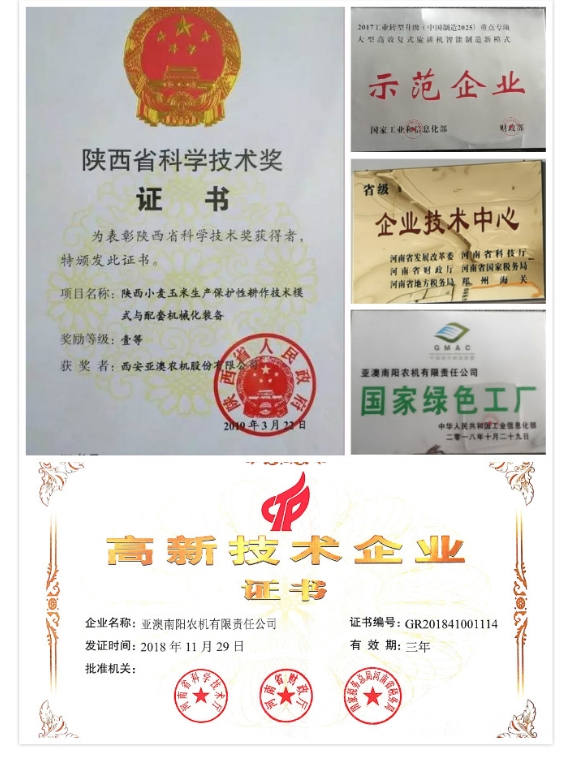 亞澳農(nóng)機(jī)堅(jiān)持“產(chǎn)品就是人品、內(nèi)在是我心、外在是我臉”的品質(zhì)原則,多功能變速旋耕機(jī)、旋播施肥機(jī)、聯(lián)合耕整機(jī)、雙軸滅茬機(jī)、精量免耕播種機(jī)、深松機(jī)等產(chǎn)品在耕整機(jī)械(主機(jī)配套40-300馬力)領(lǐng)域處于行業(yè)前列, 累計(jì)取得自主專利78項(xiàng)。2018年“亞澳”商標(biāo)獲得中國(guó)馳名商標(biāo),產(chǎn)品多次被中國(guó)農(nóng)機(jī)化協(xié)會(huì)、中國(guó)農(nóng)業(yè)機(jī)械流通協(xié)會(huì)、中國(guó)農(nóng)業(yè)機(jī)械工業(yè)協(xié)會(huì)授予“AAA級(jí)信用企業(yè)”、“技術(shù)進(jìn)步獎(jiǎng)”、“產(chǎn)品創(chuàng)新獎(jiǎng)”、“全國(guó)農(nóng)機(jī)用戶滿意品牌”、“最具影響力品牌”,被國(guó)家相關(guān)部委單位授予農(nóng)業(yè)部科技進(jìn)步三等獎(jiǎng)、星火計(jì)劃金獎(jiǎng)、西安市科技進(jìn)步一等獎(jiǎng)、陜西省行業(yè)之星企業(yè),“專精特新”中小企業(yè),南陽(yáng)市級(jí)科技百?gòu)?qiáng)企業(yè)等多項(xiàng)殊榮;國(guó)家型高新技術(shù)企業(yè),在農(nóng)機(jī)行業(yè)中具有較高的美譽(yù)和知名度,得到了社會(huì)的廣泛認(rèn)可。